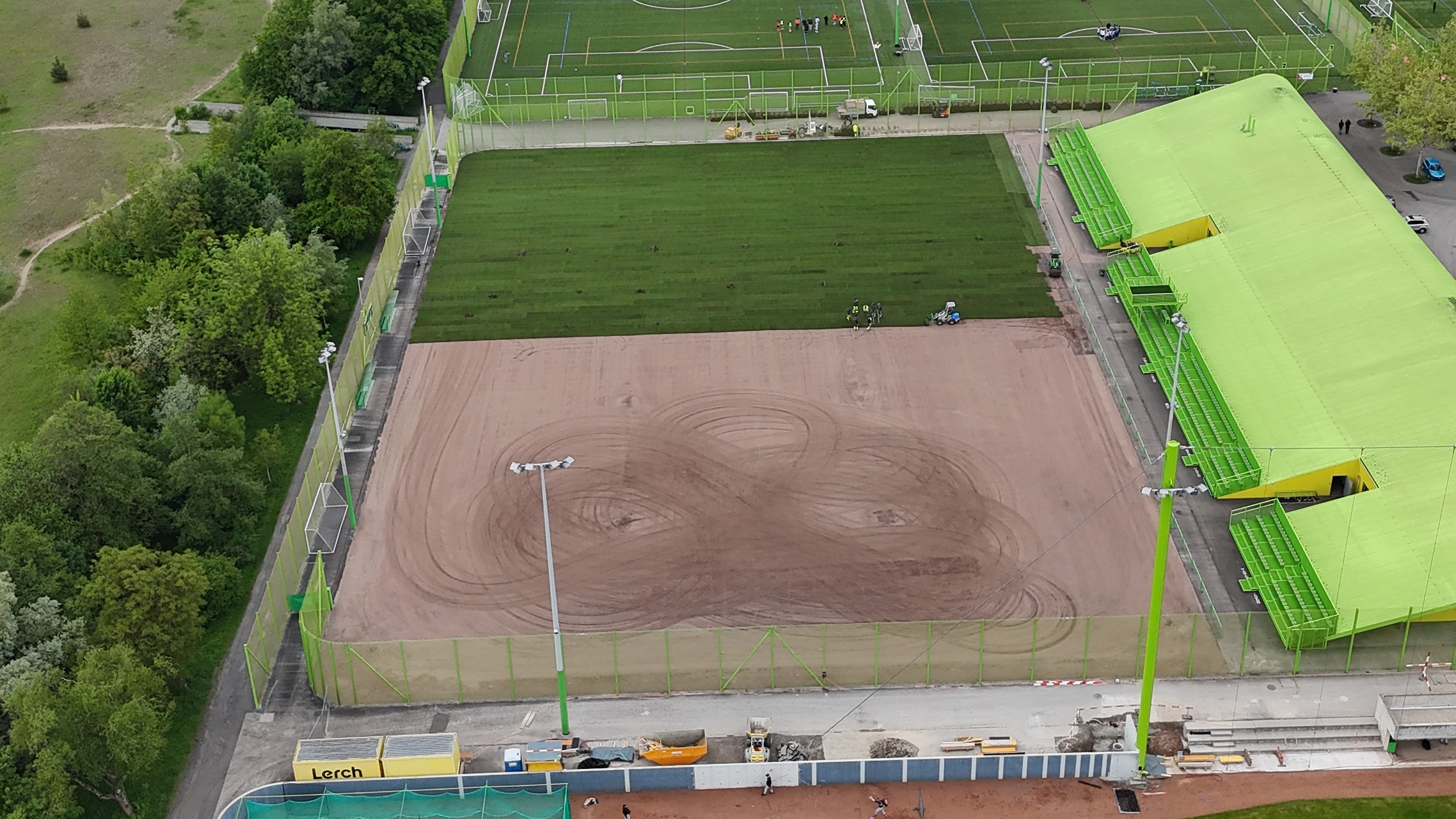 Darauf aufbauend wurde eine exakte Planie hergestellt, um eine gleichmässige, sportgerechte Spielfläche zu gewährleisten. Den Abschluss bildete die Verlegung von hochwertigem Rollrasen, der den Plätzen sofort ein dichtes, ebenmässiges und belastbares Erscheinungsbild verlieh.