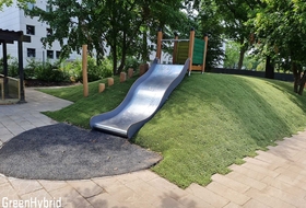 Il nostro prato ibrido Nordic Lawn è realizzato con lo stesso materiale del prato artificiale, ma in quantità minori. I fili d'erba sono realizzati in polietilene (PE), mentre la rete (su cui sono cuciti i fili) è ricoperta di lattice, un materiale altamente resistente.